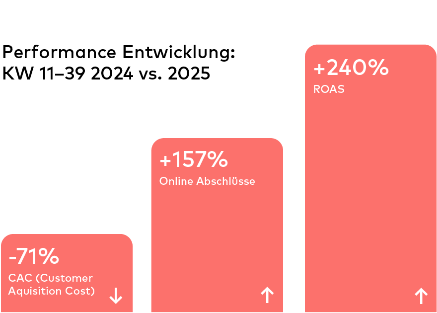 Seit der Übernahme des Google Ads Accounts durch otago im März 2025 zeigt die Performance steil nach oben. Die Online-Abschlüsse stiegen um 157 %, während die Customer Acquisition Costs (CAC) um 71 % gesenkt wurden.